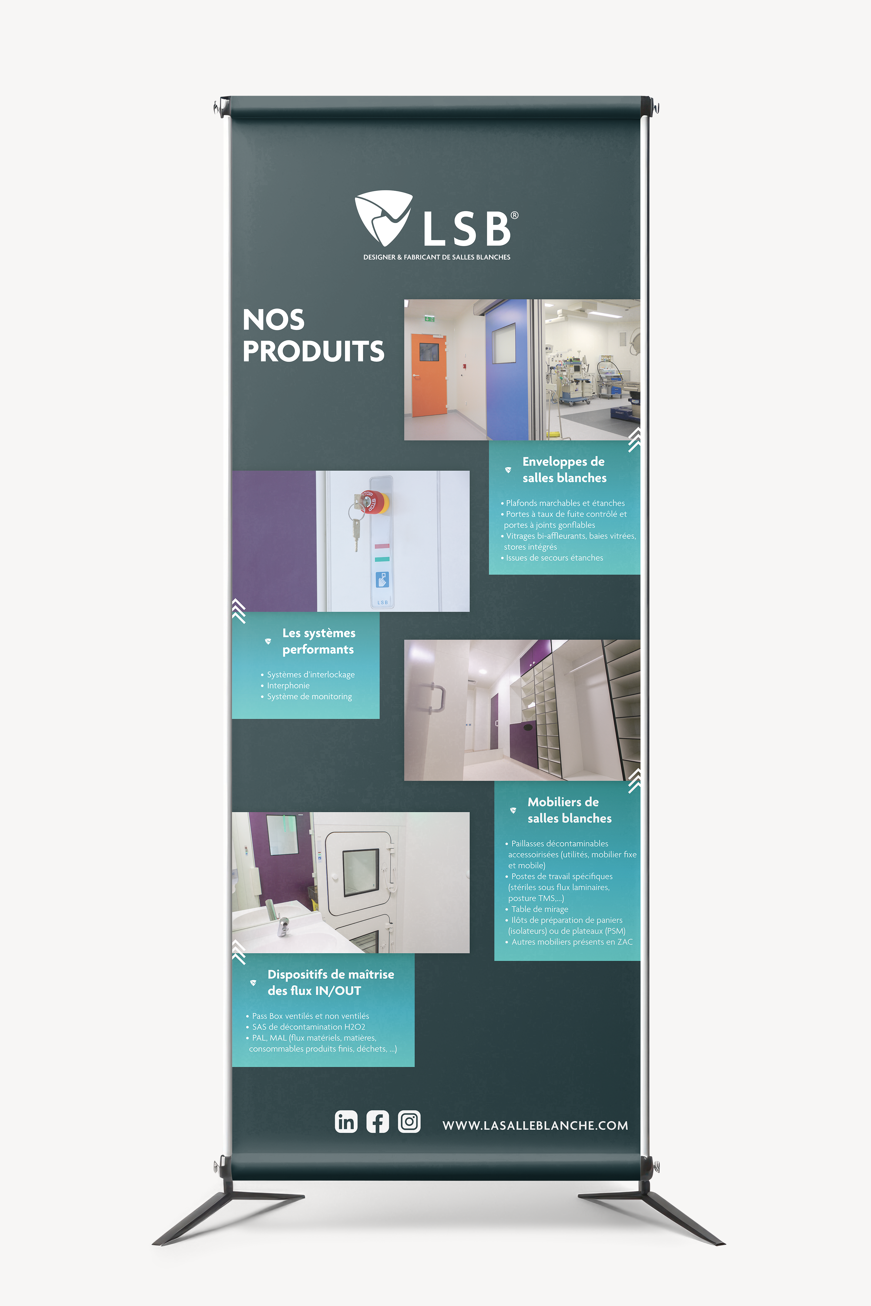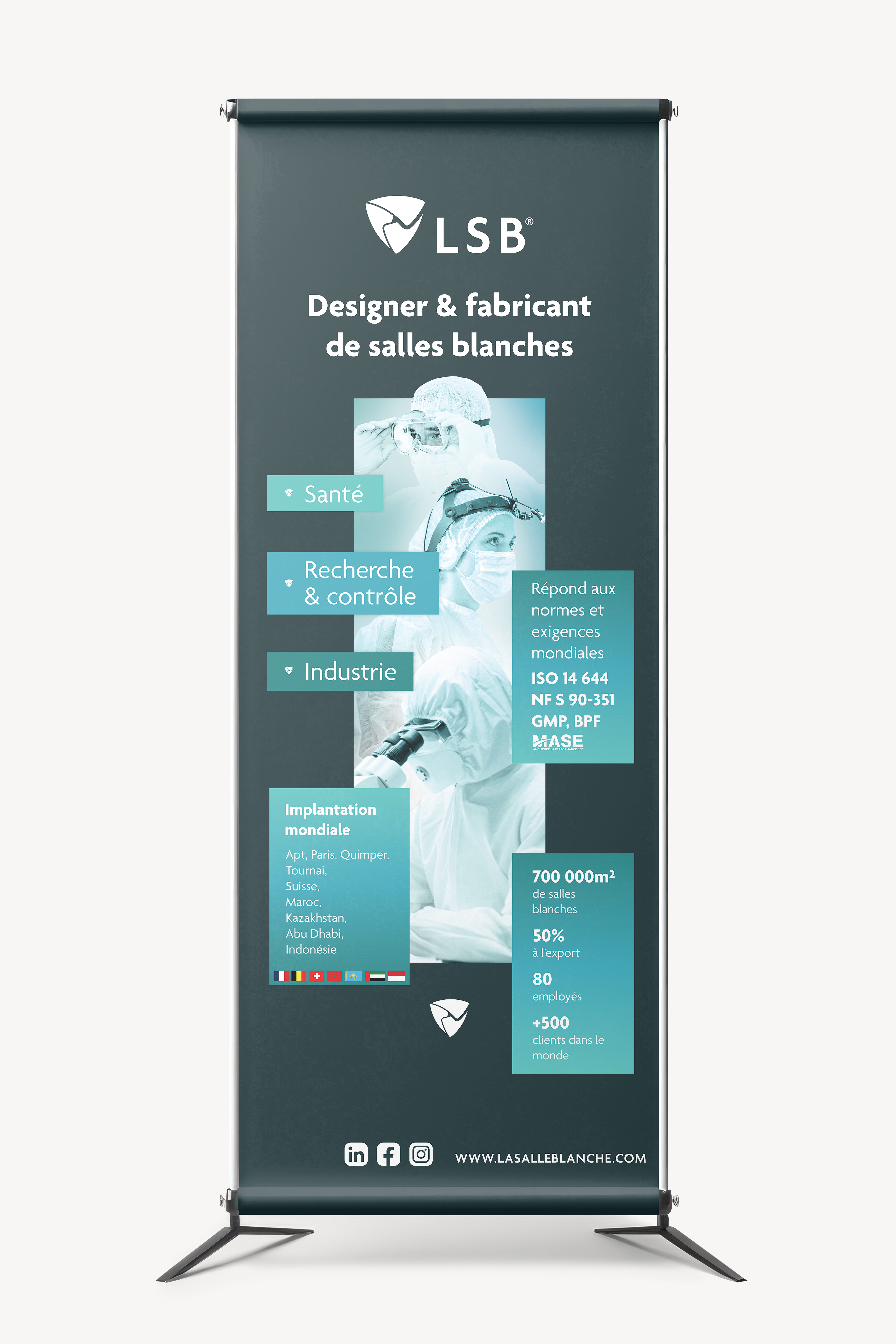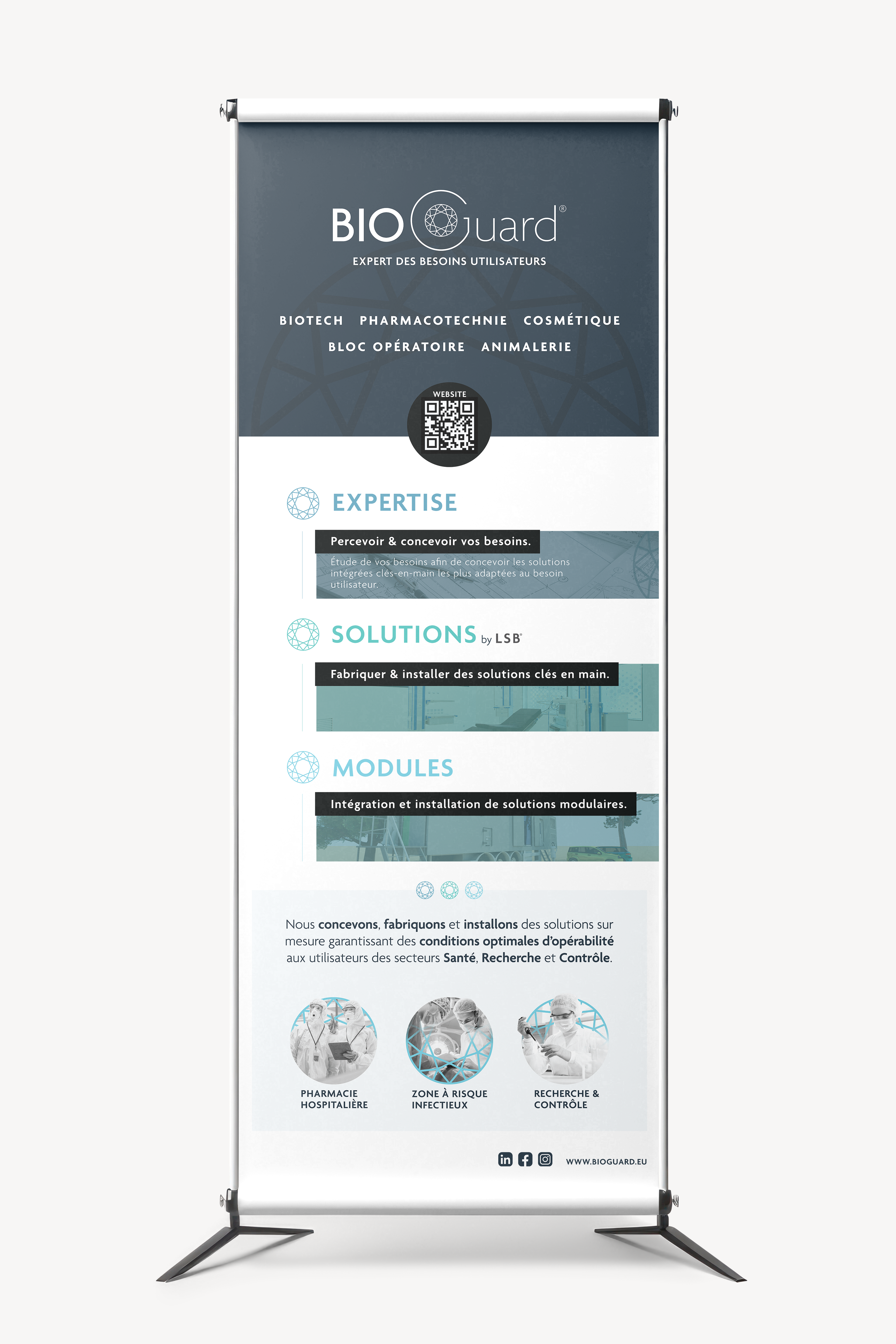 Series of four roll-ups designed for use at professional trade shows. These banners aim to clearly and effectively communicate the services and expertise of two companies specialized in controlled environments.