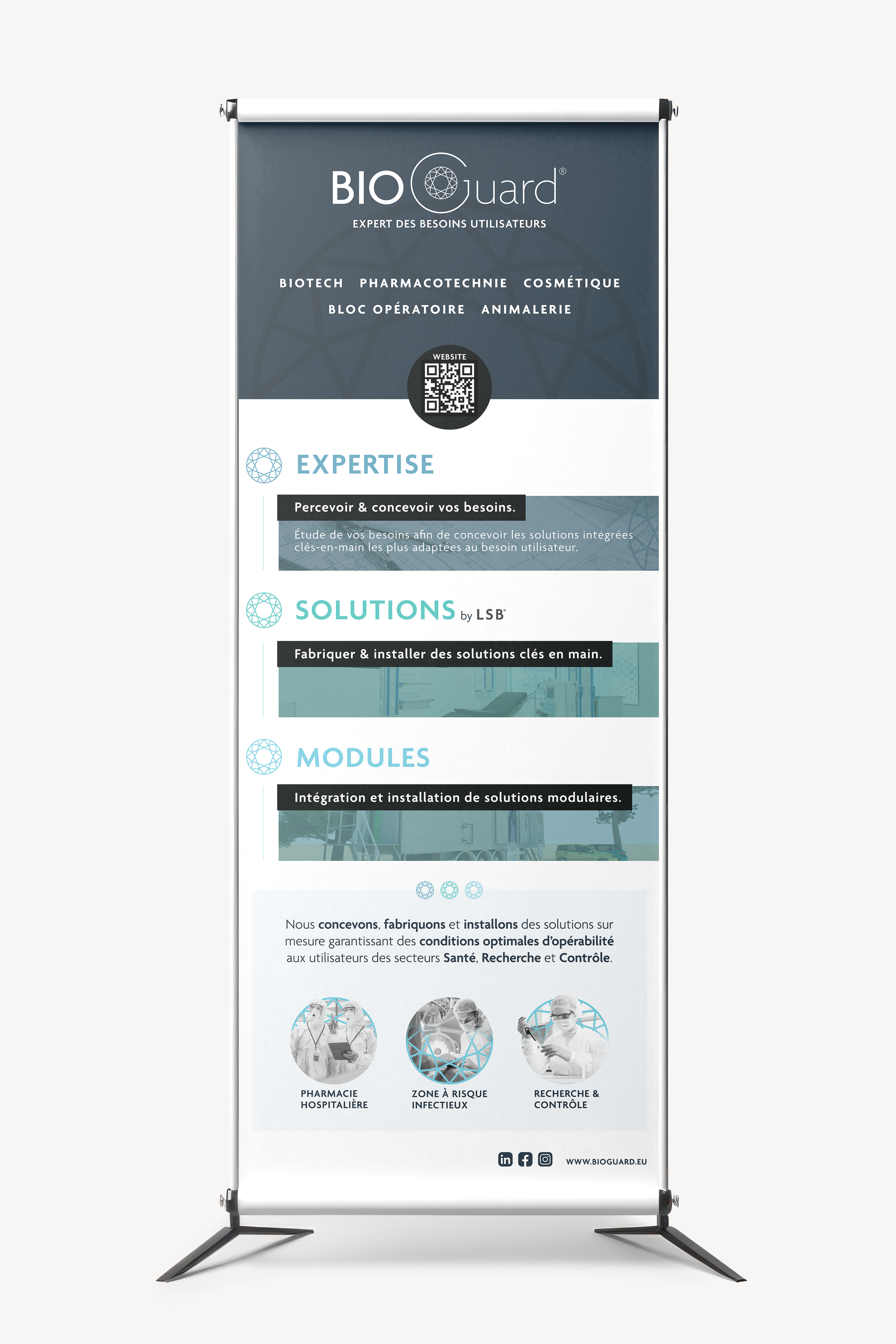 The two BIOGuard roll-ups follow a clean, vertical structure divided into three key segments: Expertise, Solutions, and Modules. Each section is supported by an icon and a background image that enhances visual flow and segmentation. The logo, placed prominently at the top, features a faceted circular symbol inspired by a diamond, symbolizing strength, clarity, and precision. The dominant color is a deep blue-grey gradient, balanced with crisp white to ensure optimal readability and breathing space.